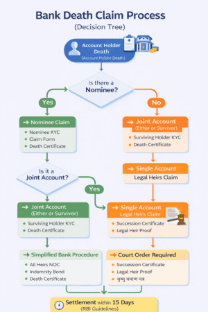 जब किसी बैंक खाताधारक की मृत्यु होती है, तो उनके खाते में जमा धनराशि का भुगतान पाने की प्रक्रिया (Death Claim Settlement Process) शुरू करनी होती है। यह प्रक्रिया उस स्थिति पर निर्भर करती है कि खाताधारक ने नामांकित (Nominee) व्यक्ति निर्धारित किया था या नहीं, खाता संयुक्त (Joint Account) है या एकल, तथा खाते में सर्वाइवरशिप मैन्डेट (Either or Survivor / Former or Survivor) जैसी शर्तें हैं। नीचे विभिन्न स्थितियों में पैसे क्लेम करने की विस्तृत जानकारी दी गई है। इसमें बैंक जमा खाते (बचत, चालू, FD आदि) से लेकर सेफ़ डिपॉज़िट लॉकर के Death Claim Settlement तक सभी पहलुओं को शामिल किया गया है।